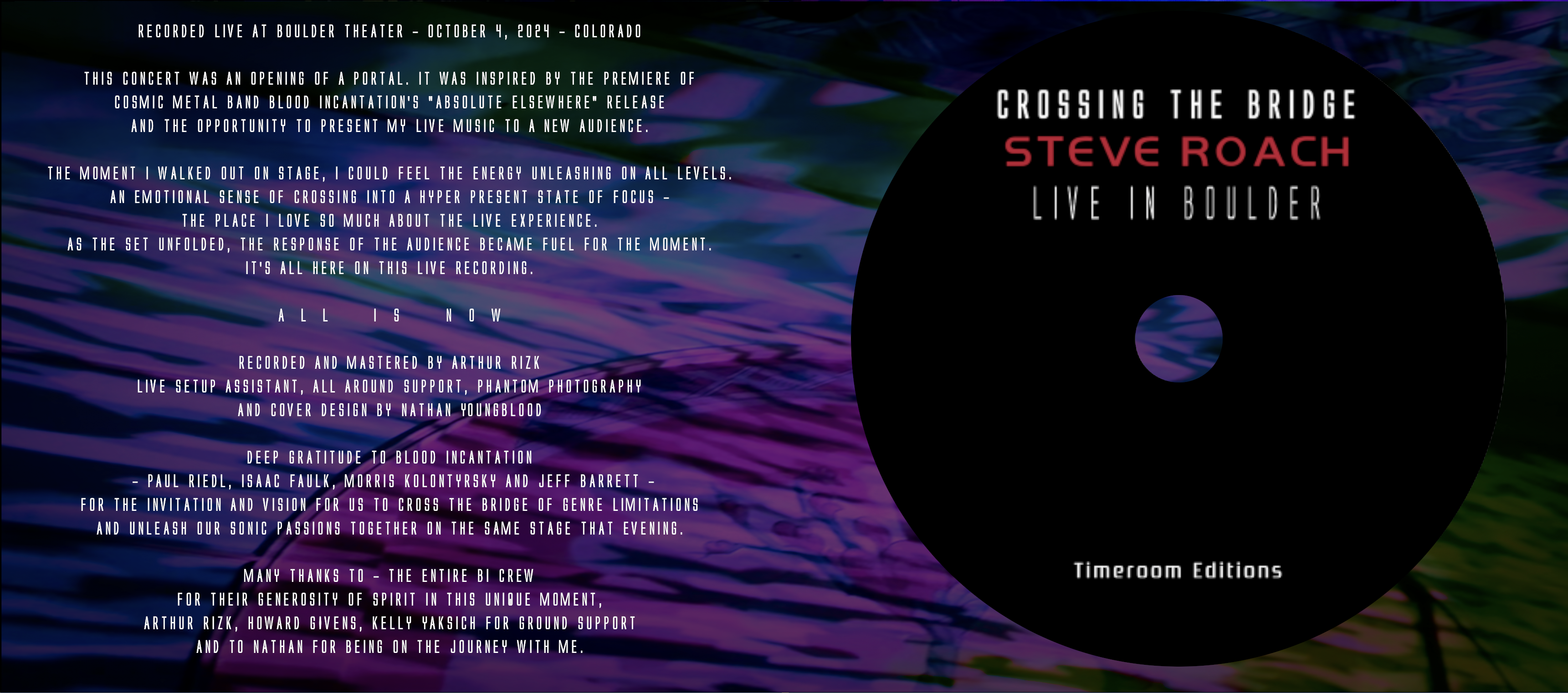 The story goes that Decibel‘s Kevin Stewart-Panko, while slinging merch for Blood Incantation on tour, visits a record store in Arizona. The owner knows the management of Steve Roach. Blood Incantation are big fans of Roach. One thing leads to another, Roach becomes a BI fan, and this poster appears: Roach opening for Blood Incantation playing their album Absolute Elsewhere in the Boulder Theater.